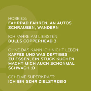 Mein Hobby: Fahrrad fahren, an Autos schrauben, Wandern,